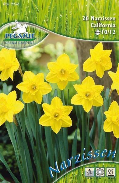 Narcissus California nagykoronájú nárcisz virághagymák Virághagyma körmérete: 10/12 cm Növény várható magassága: 40 cm Javasolt ültetési ideje: szeptember-december Virágzás ideje: április Vágott virágnak is alkalmas A nagykoronájú nárciszok lenyűgözõ, nagy méretű virágaikról ismertek, amelyek látványosan kiemelkednek a tavaszi kertben. Hosszú, széles koronával re