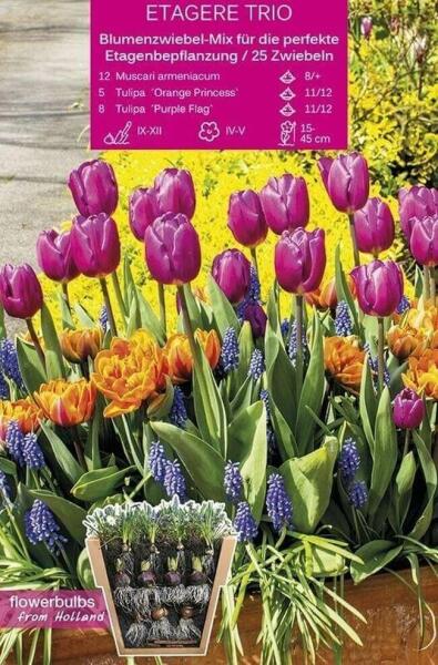 Etagere Trio virághagyma összeállítás Csomag tartalma: 5 db Tulipa Orange Princess 11/12 cm-es tulipán virághagyma 8 db Tulipa Purple Flag 11/12 cm-es tulipán virághagyma 12 db Muscari armeniacum 8/+ cm-es gyöngyike virághagyma Növények várható magassága: 15-45 cm Javasolt ültetési ideje: szeptember-december Virágzás ideje: április-május Balkonládába is ültethetõ Stíluso