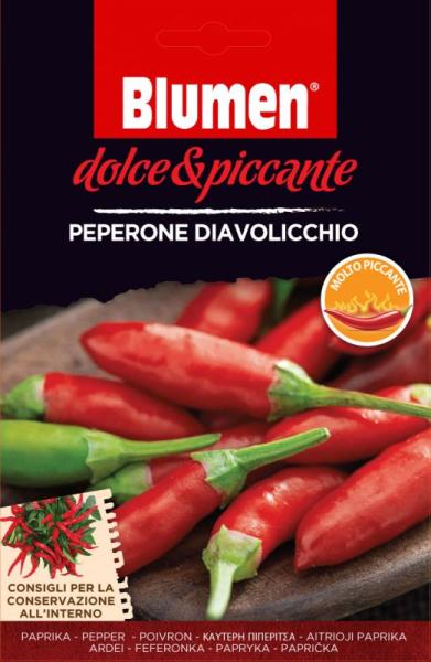 Peperone Diavolicchio, csípõs F1 hibrid pepperóni chili paprika 30.000 scoville skála erõsségű, átlagosan csípõs paprika. A termés 2-3 cm hosszú és amikor beérik bepirosodik. Javasoljuk nyersen történõ fogyasztásra, ill. lekvár készítésére ill. olajban történõ tartósításra. Edénybe is vethetõ, de ágyásba is egyéb fajtákkal együtt. Napigényes. Javasolt vetési h