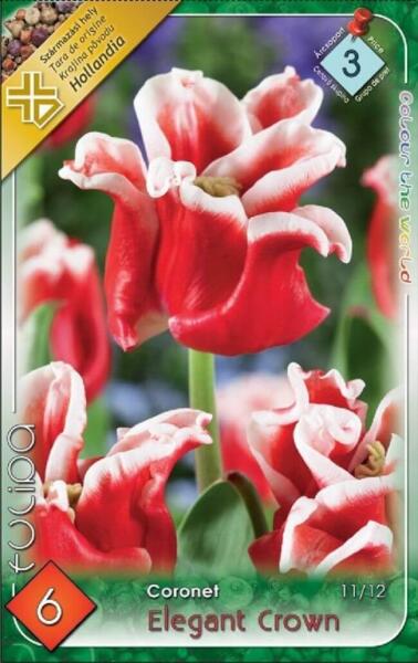 Tulipa Coronet Elegant Crown tulipán virághagymák 2' Virághagyma körmérete: 11/12 cm Javasolt ültetési ideje: Szeptember-December Virágzás ideje: Április-május Javasolt ültetési távolság: 10 cm Javasolt ültetési mélység kb. : 10 cm Növény várható magassága kb. : 45 cm Termesztett állományból származó növény. Származási hely: EU A Coronet tulipánok újabban létre