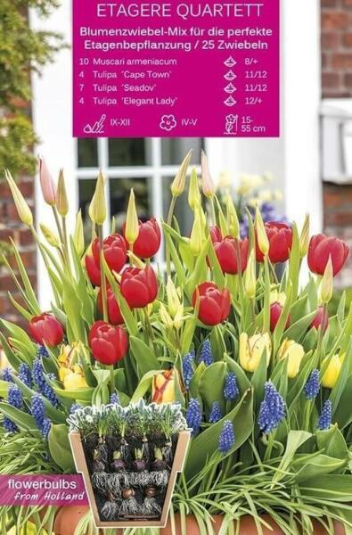 Etagere Quartett virághagyma összeállítás Csomag tartalma: 4 db Tulipa Cape Town 11/12 cm-es tulipán virághagyma 7 db Tulipa Seadov 11/12 cm-es tulipán virághagyma 4 db Tulipa Elegant Lady 12/+ cm-es tulipán virághagyma 10 db Muscari armeniacum 8/+ cm-es gyöngyike virághagyma Növények várható magassága: 15-55 cm Javasolt ültetési ideje: szeptember-december Virágzás ideje: áp