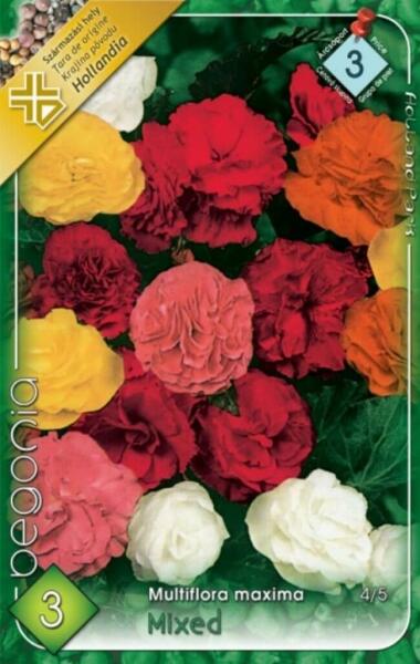 Begonia Multiflora maxima Mixed vegyes begónia gumók 3' Javasolt ültetési ideje: IV. -V. Virágzás ideje: VII. -X. Javasolt ültetési távolság: 25 cm Javasolt ültetési mélység kb. : 5 cm Növény várható magassága kb. : 20 cm Termesztett állományból származó növény. Származási hely: EU A begónia szabad virágágyásokba, cserépbe, balkonládába is ültethetõ. Gondozása