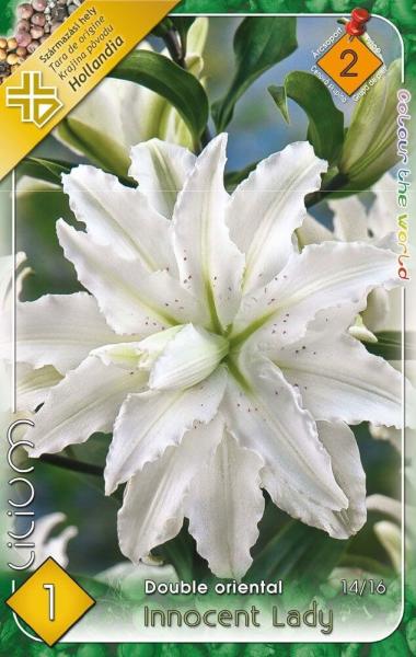 Oriental Innocent Lady dupla szírmú liliom Javasolt ültetési ideje: III. -V. vagy X. -XII. Virágzás ideje: VI. -VIII. Javasolt ültetési távolság: 20 cm Javasolt ültetési mélység kb. : 15 cm Növény várható magassága kb. : 100 cm Származási hely: EU A teltvirágú liliom nagytermetű hagymás növény, mely évelõágyak magasabb növényeként, valamint szoliterként is megáll