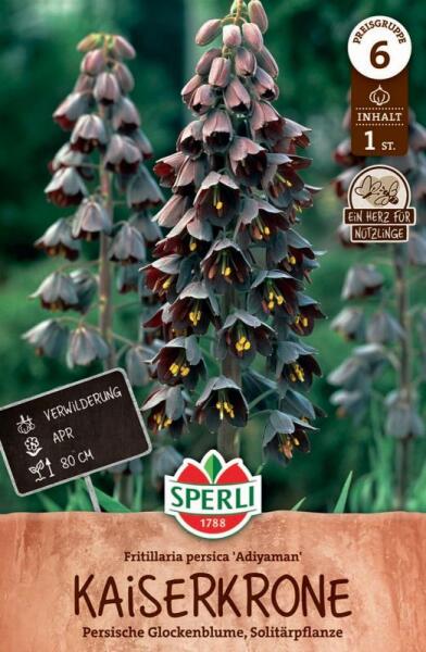Persische Kaiserkrone Adiyaman asszír kockásliliom virághagyma Növény várható magassága: 80 cm Javasolt ültetési ideje: szeptember-december Virágzás ideje: április Egy különleges és elegáns hagymás növény. Keskeny, bókoló virágai sötét lila színűek, amelyek alsó része aranysárga, így különleges kontrasztot képeznek. Tavasszal virágzik, és legjobban napos vagy f
