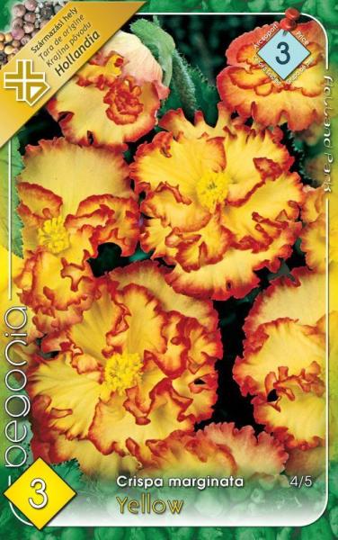 Crispa Marginata Yellow sárga begónia Javasolt ültetési ideje: IV. -V. Virágzás ideje: VI. -X. Javasolt ültetési távolság: 25 cm Javasolt ültetési mélység kb. : 5 cm Növény várható magassága kb. : 20 cm Termesztett állományból származó növény. Származási hely: EU A begónia szabad virágágyásokba, cserépbe, balkonládába is ültethetõ. Gondozása nem igényel kül