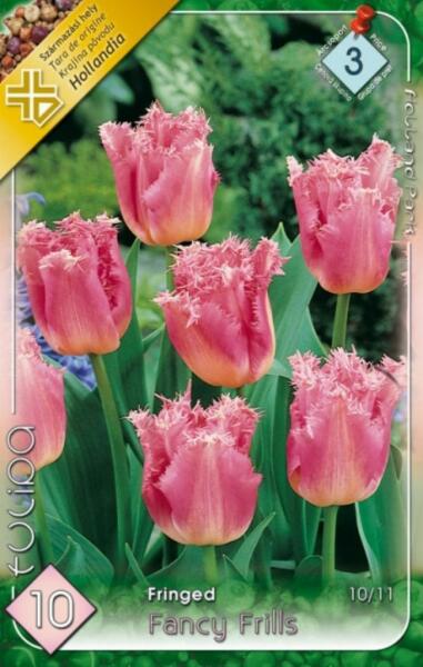 Tulipa Fringed Fancy Frills tulipán virághagymák Virághagyma körmérete: 10/11 cm Javasolt ültetési ideje: Szeptembertõl- Decemberig Virágzás ideje: Április Javasolt ültetési távolság: 10 cm Javasolt ültetési mélység kb. : 10 cm Növény várható magassága kb. : 50 cm A Crispa tulipánok 50 cm szárhosszúságú különösen szép színű tulipánok, amelyek igen hosszan virá
