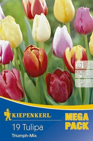 Tulipa Triumph-Tulpen-Mix vegyes tulipán virághagymák MEGA PACK Virághagyma körmérete: 11/12 cm Növény várható magassága: 45 cm Javasolt ültetési ideje: szeptember-december Virágzás ideje: április Vágott virágnak is alkalmas A Kiepenkerl 'Triumph Tulpen Mix' virághagyma csomag különbözõ Triumph tulipánokat tartalmaz, amelyek gazdag színskálán virágoznak. A keverék piro