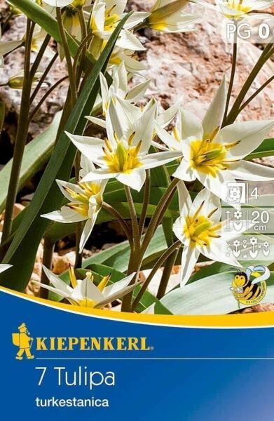 Tulipa turkestanica botanikai tulipán virághagymák Virághagyma körmérete: 6/7 cm Növény várható magassága: 20 cm Javasolt ültetési ideje: szeptember-december Virágzás ideje: március Balkonládába is ültethetõ A botanikai tulipánok kisebb méretűek és természetes formájukban nõnek, közelebb állnak vadon élõ rokonaikhoz. Ezek a tulipánok ideálisak sziklakertbe, elõker