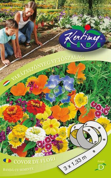 Rédei kertimag Varázsszõnyeg vetõszalag 3x1,33 méter D'Vetõszalag használatával elkerüljük a ritkítás fáradtságos munkálatát. Gyors és egyszerű a vetés, a növények jobban fejlõdnek, a felhasznált környezetbarát papír lebomlik a talajban. Fajtajellemzõk: a Varázsszõnyeg egynyári virágkeverék alacsony növésú (kb 40 cm) színes virágokból áll, melyek egész nyár