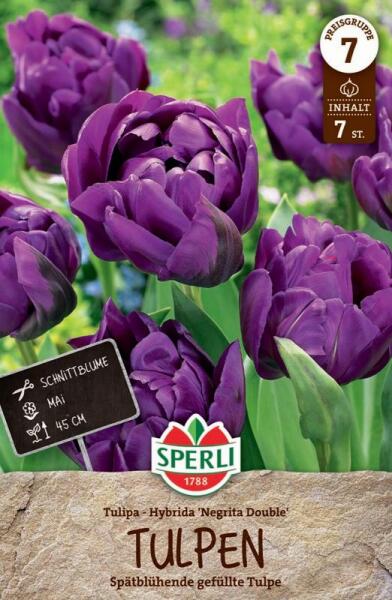Gefüllte Späte Tulpe Negrita Double kései teltvirágú tulipán virághagyma Virághagyma körmérete: 11/12 cm Növény várható magassága: 30-60 cm Javasolt ültetési ideje: szeptember-december Virágzás ideje: március-május Vágott virágnak is alkalmas A kései teltvirágú tulipánok a tavasz végén nyílnak, bámulatos, nagy és tömött virágfejükkel. Széles színskálán mozog