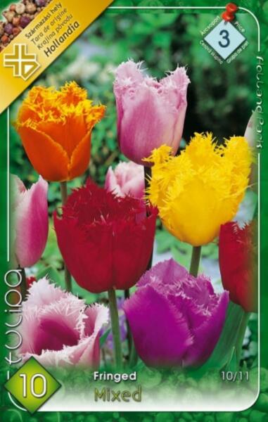 Tulipa Fringed mixed vegyes tulipán virághagymák Virághagyma körmérete: 10/11 cm Javasolt ültetési ideje: Szeptember - December Virágzás ideje: Április Javasolt ültetési távolság: 10 cm Javasolt ültetési mélység kb. : 10 cm Növény várható magassága kb. : 50 cm A Crispa tulipánok 50 cm szárhosszúságú különösen szép színű tulipánok, amelyek igen hosszan virágozna