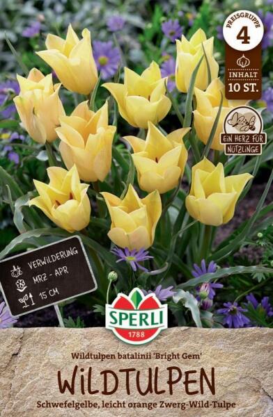 Wildtulpe batalinii Bright Gem botanikai tulipán virághagyma Virághagyma körmérete: 11/12 cm Növény várható magassága: 30-60 cmJavasolt ültetési ideje: szeptember-decemberVirágzás ideje: március-májusVágott virágnak is alkalmas A botanikai tulipánok kisebb méretűek és természetes formájukban nõnek, közelebb állnak vadon élõ rokonaikhoz. Ezek a tulipánok ideálisak szi