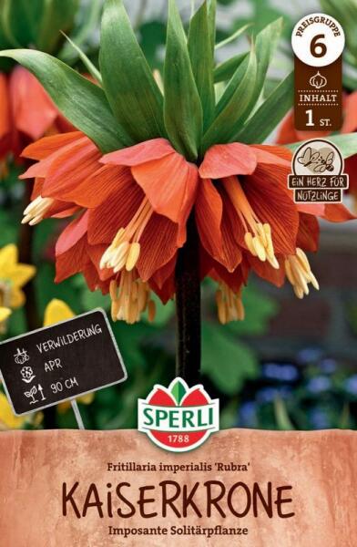 Kaiserkrone Rubra császárkorona virághagyma Növény várható magassága: 90 cm Javasolt ültetési ideje: szeptember-december Virágzás ideje: április A 'Rubra' fajta virágai sötét narancssárga vagy piros színűek, kifejlett magassága 80-100 centiméter között alakul. A száron örvökben állnak a lándzsa alakú levelek, ezek fölé emelkedik az erõs virágzati szár és rajta a