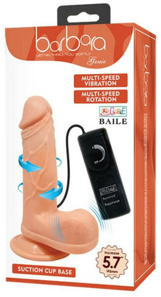 Barbara élethű vibrációs pénisz távirányítóval Rendkívül rugalmas anyagú élethűen megformált dildó alján tapadókoronggal, közepes méretben vibrációs , forgós változatban. A vibráció és a forgás erőssége egy vezetékes távirányító segítségével szabályozható. Finoman erezett felszín , formás makk és herék jellemzik ezt a pénisz formájú kényeztetőt, mel