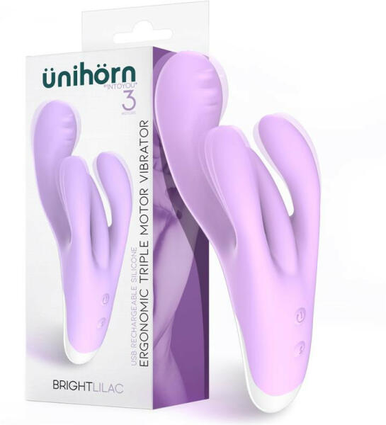 Ünihörn Brightlilac három motoros, négyágú vibrátor. Különleges formavilággal rendelkező, nagyon hatékony stimulációt ígérő vibrátor. Az eszköz erősen hajlított, a g-pont elérésére alkalmas formával fő ággal rendelkezik, mely törzsében igen hajlékony, ez természetesen a hüvelyi stimulációt biztosítja. A szárából még három további ág agáskodik ki, melyek s