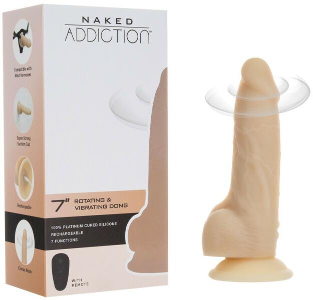 Naked Addiction vibrátor, rotációval, távirányítóval Prémium minsőégű szilikon borítással készült, kissé puha, bőrszerű kényeztető, mely kettős stimulációval dolgozik. Egyrészt van a hagyományos vibráció, amit egy erős, közepes tónusú, a makkrészben nagyon jól pozicionált motor biztosít. Másrészt a tözs felső fele kis mértékű, de határozott excentrikus mo