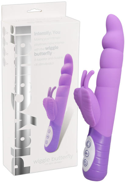 PlayCandi Wiggle Butterfly - egy bájos, pillangós vibrátor, amivel Te is az egekbe szárnyalhatsz! Kellemes, selymes tapintású, maximálisan bőrbarát, ruganyos szilikonból készült vibrátor, körbe-körbe forgó fejjel és puha, vibráló, pillangó formájú csiklóizgató karral. Elkeskenyedő, csúcsos véggel, barázdált, stimuláló felszínnel. Erős, de halk motorral. Egyszerűen