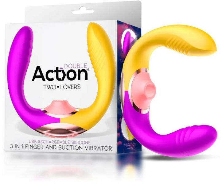 Action Two Lovers 3 az 1-ben kényeztető (vibráció, mozgás, léghullámok) Különleges formájú és tudású készülék, melyben három stimulációs módszert ötvöztek össze. Az eszköz nem rendelkezik túl nagy méretekkel, viszont cserébe kézreeső, és könnyen használható. Az első funkció a hagyományosnak mondható vibráció, amit az eszköz sárga végéban elrejtett motor
