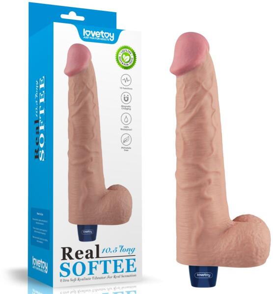 A Lovetoy 10.5" REAL SOFTEE Rechargeable TPE anagú, újratölthető valósághű vibrátor. Realisztikus kialakítású, pénisz formájú, kiváló minőségű anyagból készített, puha szárral és domború fejjel kialakított, testszövethez hasonló, bőrszerű tapintású, 10 rezgési funkcióval rendelkező, erezett felületű, herékkel kiegészített vibrátor. Tisztítása: minden hasz