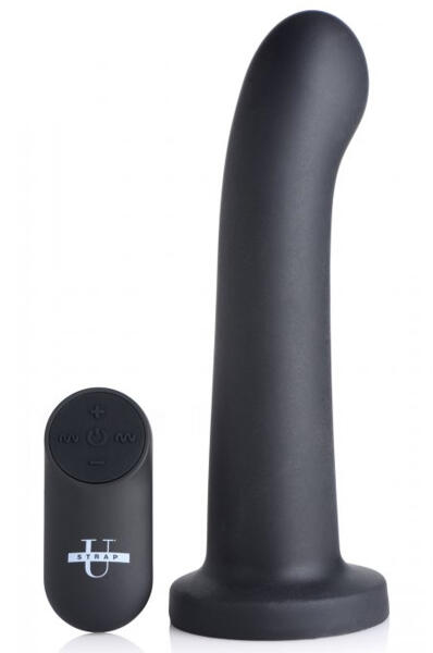 Target the G-spot or P-spot! Perfectly designed to fit into standard harnesses for strap-on use, this luxurious dildo is made of liquid silicone to create a velvety-smooth finish with plenty of flexibility. Indulge in 3 speeds and 7 modes of powerful vibration, easily controlled by the wireless remote for more convenience and excitement. A dramatic curve at the tip provides an ideal shape for stim