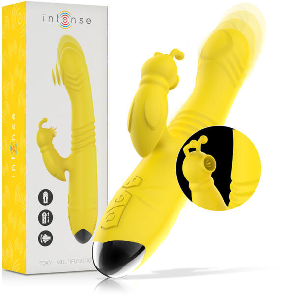 INTENSE - TOKY MULTIFUNKCIÓS VIBRÁTOR FEL ÉS LE KLITORISZ STIMULÁTORRAL SÁRGA A INTENSE márka's TOKY multifunkciós vibrátor egy kivételes szexuális játék, amelyet úgy terveztek, hogy a következő szintre emelje az élvezetet. Ez az újratölthető, up&down (felfelé és lefelé mozgó) vibrátor páratlan stimulációs élményt nyújt. A 8 féle pulzációval és a 8 nyalási m