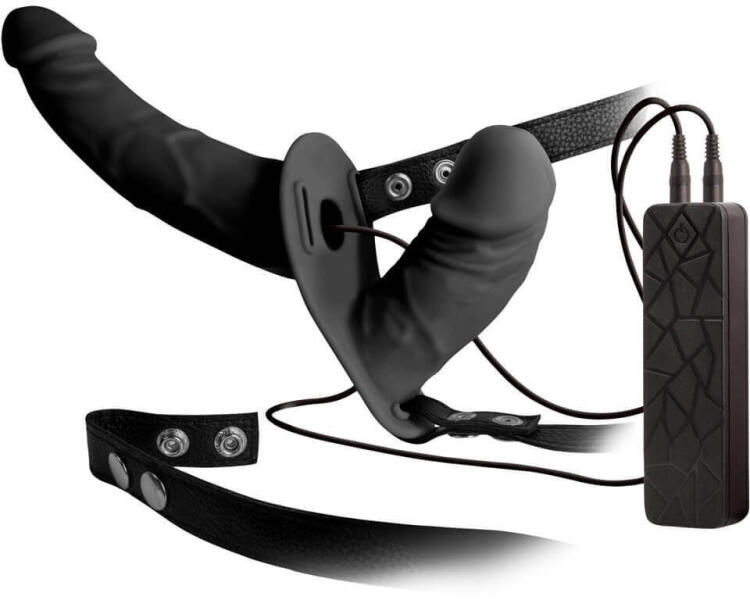Valódi bőr pántokkal ellátott, szerepcserés játékokhoz is ideális, felcsatolható vibrátor duó, hogy mindkét fél egyszerre úszhasson a gyönyörben! A hímtagok kellemes tapintású, jó tartású, de ruganyos anyagból készülnek, formás, kicsit felfelé álló makkal, erezett, stimuláló felszínnel. Mindkét vibrátor rezgése egyszerre vezérelhető a vezetékes távirányító