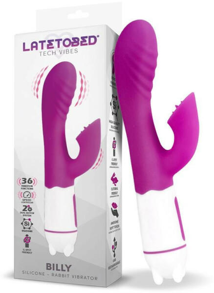 LateToBed Billy klitoriszágas vibrátor Viszonylag kis méretű, klitoriszággal szerelt vibrációs kényezető. Az eszköz teste, és a használat során kint maradó klitorisz ág is nagyon-nagyon hajlékony, lényeges részeit bőrbarát szilikon borítja. A stimulációt két darab vibrációs motor biztosítja, az egyik a fő ág fejrészében kapott helyet, amásik természetesen a klitori