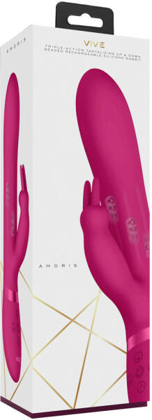 Vive Amoris klitoriszágas vibrátor, mozgó gyöngyökkel Prémium minőségű szilikonból készült, klitoriszágas, azaz nyuszis vibrátor, különleges funkcióval. Az ilyen nyuszis vibrátorok fő jellemzője, hogy a hosszabbik ág hüvelyi behelyezésre szolgál, miközben a kint maradó, jelen esetben nyuszifüles ágacska a csikló izgatását végzi. Ennél a modellnél a fenti két funk