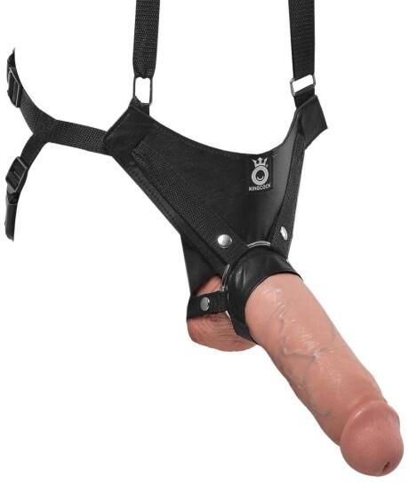 A King Cock 11" Hollow Strap-On Suspender System egy lenyűgöző erotikus eszköz, amely méretével és valósághű kialakításával tűnik ki. A dildó lenyűgöző 28 cm hosszú és 5,6 cm átmérőjű, így ideális választás az extrém méreteket kedvelők számára. A puha dildó belsejében egy 3,8 cm átmérőjű üreges műanyag cső található, ami alkalmassá teszi az eszközt az