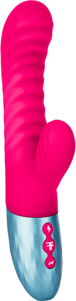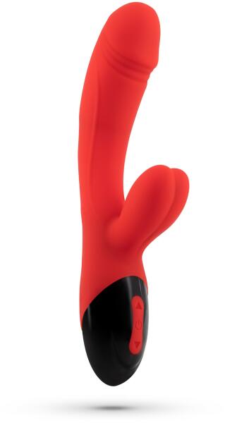 Termék részletekKiváló minőségű szilikonból készített, bordázott felületű, pénisz formájú, a fejében 10 rezgési és 10 forgó funkcióval rendelkező, a g-pont stimulálására is használható, 10 vibrátoros funkcióval ellátott csiklóizgatóval kiegészített, fém fogóval felszerelt vibrátor, LED-es kezelőgombokkal. Tisztítása: minden használat előtt és minden használat után langyo