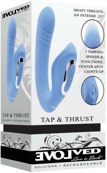 Embrace the curve! This delicious dual vibe buzzes and thrusts for internal bliss while tapping for external joy – two sensations joined with a flexible bend! Made from creamy, smooth silicone, a gently curved main shaft ends with a swelled textured head that vibrates and stretches for an erotic life-like feel while the tapping shaft treats your external erogenous zones to a lit-up pulsing beat