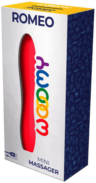 Wooomy Romeo hajlítható, akkumulátoros vibrátor Viszonylag szerény méretekkel rendelkező, hajlékony törzsrészű vibrátor. A készülék teste teljes egészbén egységes, selymes tapintású, szilikon bevonattal rendelkezik, ami vízállóságot is biztosít neki. Teste középtájon nagyon hajlékony, a többi része viszont merevnek mondható. Vibrációs motorja csúcsának közeléb