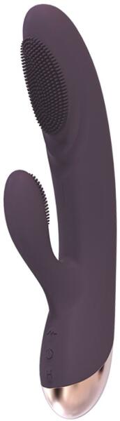 The Castalia is a rabbit vibrator made of soft silicone and ABS, with a shiny metallic look base. The smooth shaft has a curved shape and stimulating nubs on the top, like a soft brush, which is great for G-spot stimulation. The clitoris vibrator also has these soft brush-like stimulating nubs. A special feature of the Castalia is Dual Density, which means that the core is hard and the outside of