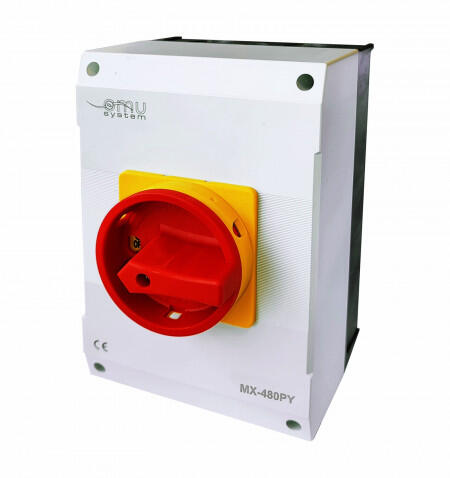 OMU system MX-480PY 4 pólusú 80A tűzvédelmi tokozott ipari kapcsoló 4x80A IP65 forgócsapos lakatolható Kikapcsolt állapotban 3 lakattal lakatolható. Pólusszám: 4 Terhelhető áramerőség Ith: 80A Teljesítmény: 37kW IP védettség: IP65 Névleges működési feszültség: max 400V AC 50/60Hz Tömszelencék mérete: 4db M25/M32, 2db M20 Méretek: 160x240x165mm Megfelel az alábbi szabv