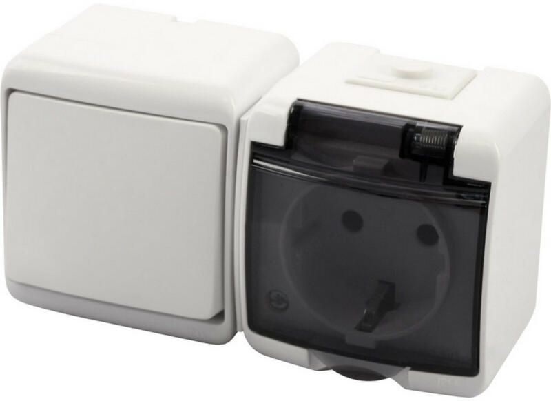Aquastar Kapcsoló+dugalj IP54 vízszintes, fehér komplett, falon kívüli, horizontális, 10A/16A, 250V, 60Hz, IP54, kültéri, fehér