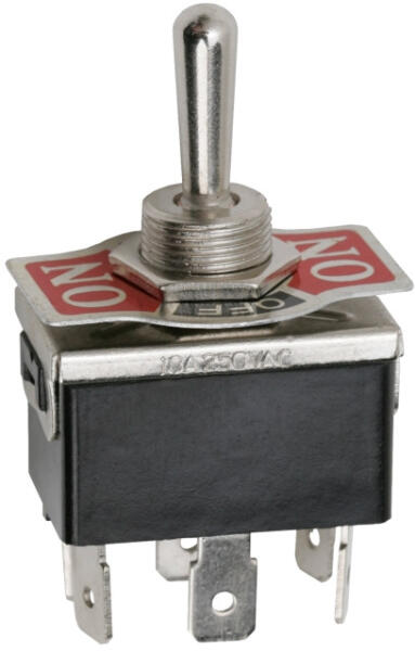 Karos kapcsoló 2 áramkör 10 A - 250 V ON - OFF - ON előlappal Karos kapcsoló, fém kivitel, kiválóan alkalmas műszaki gépek, berendezésekbe történő beépítésre. Maximum 10 A-ig terhelhető, fém előlappal rendelkezik. 2 áramkör ON - OFF - ON állású 10 A - 250 V Előlappal Kapcsoló típusa:DPDTÁramerősség:10 A (15 A) - 250 V ACBeépítési mélység:30,3 mmKapcsolóház sz