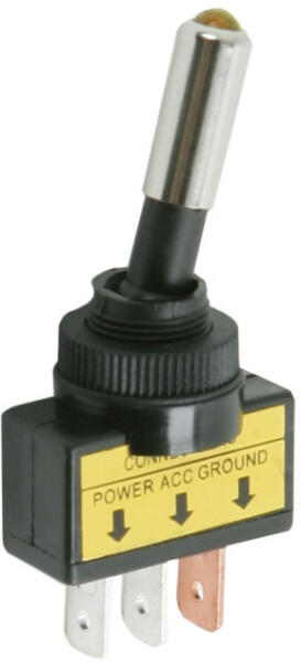 Karos kapcsoló 1 áramkör 20 A - 12 V DC ON - OFF sárga LED-del Karos kapcsoló, a kar végén sárga LED-del, amely kiválóan alkalmassá teszi elektromos eszközökbe, járművekbe történő beépítését. A kapcsoló állapota a visszajelző sárga LED-nek köszönhetően könnyen megállapítható. 20 A-ig terhelhető. 1 áramkör ON - OFF állású 20 A - 12 V DC Sárga LED-del Kapcsol