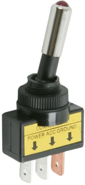 Karos kapcsoló 1 áramkör 20 A - 12 V DC OFF - ON piros LED-del Karos kapcsoló, a kar végén piros LED-del, amely kiválóan alkalmassá teszi elektromos eszközökbe, járművekbe történő beépítését. A kapcsoló állapota a visszajelző piros LED-nek köszönhetően könnyen megállapítható. 20 A-ig terhelhető. 1 áramkör ON - OFF állású 20 A - 12 V DC Piros LED-del Kapcsoló t