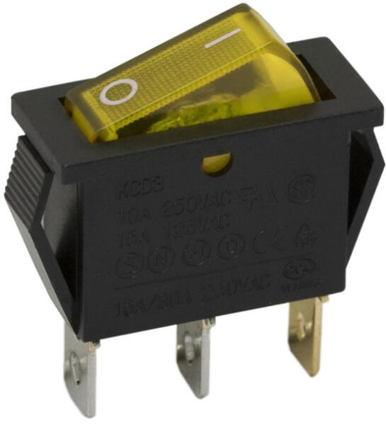 Billenő kapcsoló 1 áramkör 16 A - 250 V OFF - ON sárga világítással Beépíthető műanyag billenőkapcsoló, sárga világítással. Kompakt méretének köszönhetőn kényelmesen elfér a legtöbb kezelőfelületen. A Sárga világításnak köszönhetően messziről megállapítható a kapcsoló állapota. Beépíthető pl:: elektromos eszközök, gépek kezelőpaneljébe. 1 áramkör
