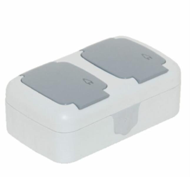 TP ELECTRIC Dupla 220V dugalj - fedéllel (vízszintes) - IP54 (5db/doboz) (3201-125-0601) T ermékinformáció: Falon kívüli, vízmentes dupla dugalj fedélel Anyaga: műanyag Méret: 80 x 134 mm Vízszintes típus Névleges áram: 10A Névleges feszültség: 220V IP védettség: IP54