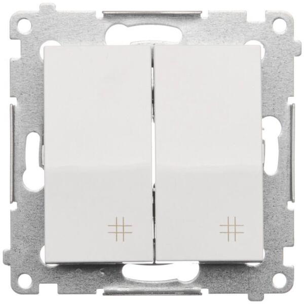 Dupla keresztkapcsoló (modul) 10AX 250V, gyorscsatlakozó, fehér színű Specifikáció: Sorozat: Simon 54 prémium Termék neve: Dupla keresztkapcsoló Színe: 1: Fehér Típus: modul Maximális áram: 10 A Feszültség: 250 V AC A csatlakozók típusa IP-védelem: IP20 / IP44 Használjon DU kerettömítést az IP44-es ellenállási osztály eléréséhez... Piktogram Anyagtípus: Halogénmente