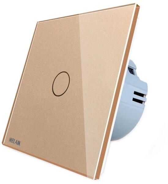 Welaik A1911CG érintőkapcsoló, üveglap, arany A Welaik kapcsolók kiváló minőségű termékek, nagy tartóssággal. Intuitív, modern kialakításuk lehetővé teszi az egyszerű telepítést. A Welaik termékek ROHS, CE és egyéb külföldön kiállított harmadik felek tanúsítványaival összhangban működnek. Azon kevés érintőmodulok egyike, amelyek 1 W-tól 1000 W-ig működnek.