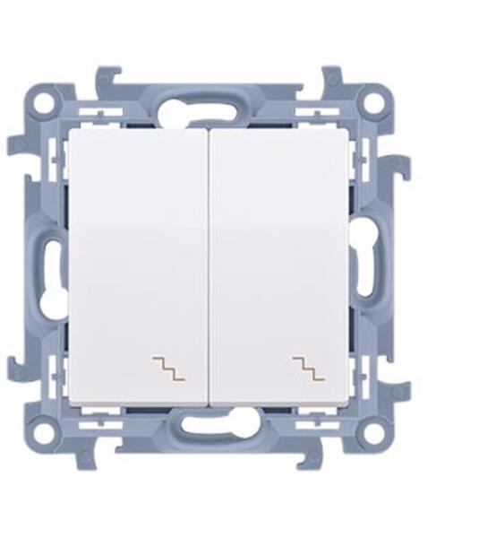 Dupla lépcsőházi kapcsoló (modul) 10AX 250V, fehér Specifikáció: Sorozat: Simon 10 Termék neve: Dupla lépcsőházi kapcsoló Színe: 1: Fehér Típus Maximális áram: 10 A Feszültség: 250 V AC A csatlakozók típusa IP-védelem: IP20 / IP44 Használjon CU kerettömítést az IP44 ellenállási osztály eléréséhez... Piktogram Anyagtípus: Halogénmentes műanyag, PC Felületkezelés