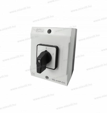 OMU system MX-416P-CO 4 pólusú tokozott ipari kézi átkapcsoló 1-0-2 4x16A IP65 Pólusszám: 4 Terhelhető áramerőség Ith: 16A IP védettség: IP65 Névleges működési feszültség: max 400V AC 50/60Hz Tömszelencék mérete: M20/25 Méretek: 100x125x120m m Megfelel az alábbi szabványoknak: EN 60947-1, EN-60947-3, EN 60947-5-1, EN 60204-1