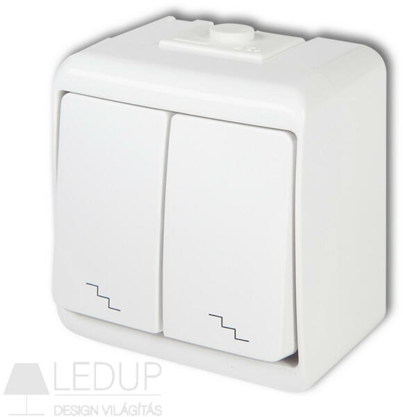 Dupla lépcsőházi kapcsoló IP44 10AX 250V, fehér Specifikáció: Sorozat: Simon Aquaclick Termék neve: Dupla lépcsőházi kapcsoló Színe: 1: Fehér Típus Maximális áram: 10 A Feszültség: 250 V AC A csatlakozók típusa: csavaros IP védelem: IP44 Material Type: Halogénmentes műanyag, ABS Felületkezelés: fényes Mounting method: Felül vakolat. Gyors összeszerelés és szétszerel