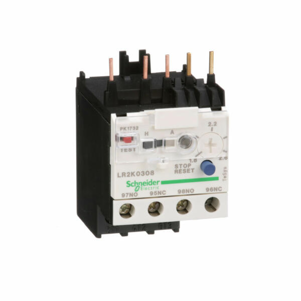 LR2K0308 Hőkioldó 1,8... 2,6A Schneider TeSys LRK termikus túláramvédelmi hőkioldó relé, 2,6 A/690 V, termikus beállítási tartomány 1,8-2,6 A, kioldási osztály 10 A, háromfázisú motorok védelmére, 0,75kW@400V. Fázismeghibásodást és fázis aszimmetriát észlelő készülék. Termikus beállító tárcsát, kézi-automatikus visszaállítás (reset) kiválasztót, egy tesztcs