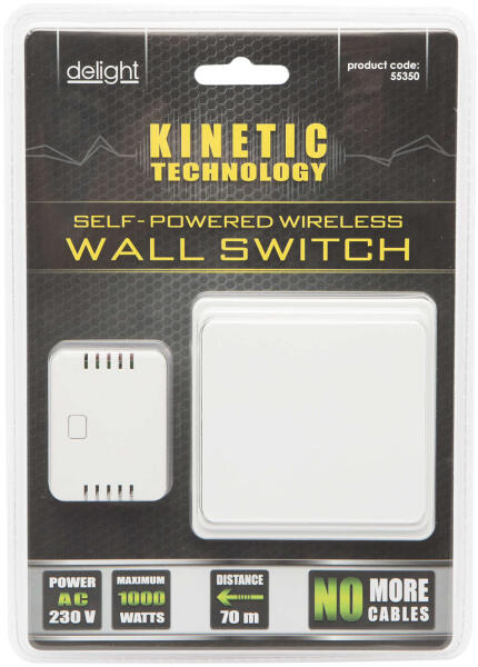 A vezeték nélküli KINETIC kapcsoló egy külső tápellátás nélküli, elemet vagy hálózati feszültséget nem igénylő rádiófrekvenciás kapcsolóból (adó) és egy vezérlőegységből áll (vevő). A kapcsoló tetszőlegesen felhelyezhető és rögzíthető bármilyen falra, konzolra vagy akár hordozva is használható, semmilyen vezetékezést nem igényel. Működése:A vezérlő
