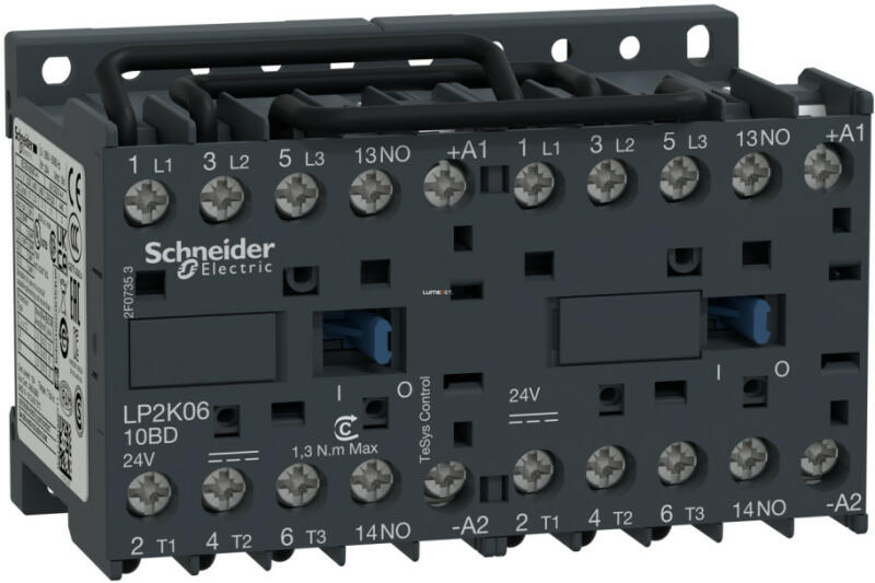 Irányváltó mágneskapcsoló 6A, 1 záró, DC, 2,4 W LP2-K0610BD Irányváltó mágneskapcsoló 6A, 1 záró, DC, 2,4 W, Tekercs: 24V DC, Schneider Irányváltó védőrelé TeSys LP2-K, 3-pólusú, AC-3 440 V 6A, tekercs 24 V DC. termékcsalád: TeSys - termék neve: TeSys K - készülék rövid megnevezése: LP2K - készülékalkalmazás: ellenőrzés - mágneskapcsoló alkalmazás: motorvezé