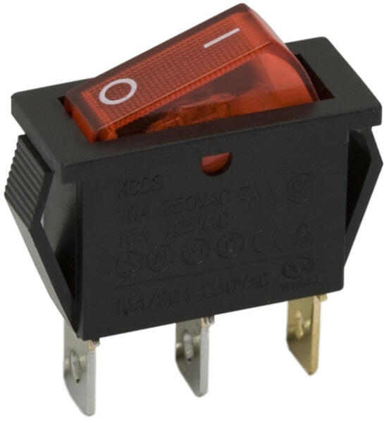 Billenő kapcsoló 1 áramkör 16 A - 250 V OFF - ON piros világítással Beépíthető műanyag billenőkapcsoló, piros világítással. Kompakt méretének köszönhetőn kényelmesen elfér a legtöbb kezelőfelületen. A Piros világításnak köszönhetően messziről megállapítható a kapcsoló állapota. Beépíthető pl:: elektromos eszközök, gépek kezelőpaneljébe. 1 áramkör 16