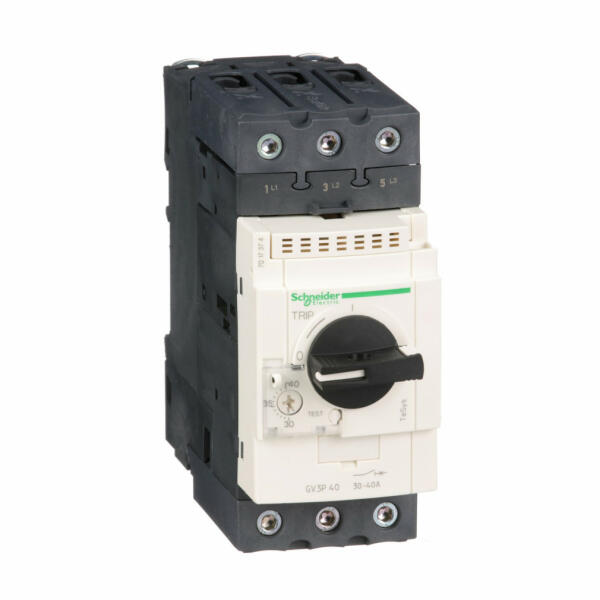 GV3-P40 Motorvédő kapcsoló 40 A Schneider TeSys GV motorvédő megszakító, 3-pólusú (3P), 40 A/690 V, 3-fázisú motor alkalmazásokhoz, 18.5kW@400V. Termikus-mágneses védelmet biztosít 30-40 A-es termikus beállítási tartományban, mágneses kioldást 14xIn értéken, nagy megszakítóképesség: Icu 50kA@400V. Csatlakozás Everlink BTR csavaros érintkezőkkel. Start-stop szabályoz